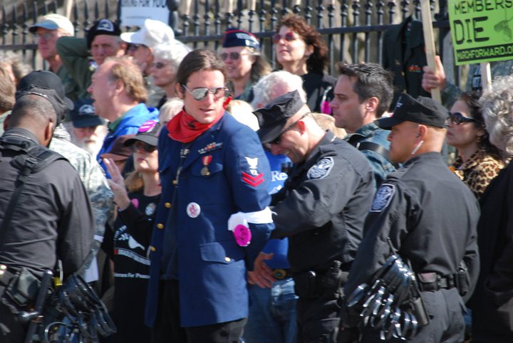 Now, 8 years into Afghanistan (I don’t like to think of it as an “anniversary”, but rather, as an annual gathering of militants to protest the continued waste of American blood and treasure in the desert sands of the mid-east, in wars of un-necessity), and 8 years into Iraq, and 10 in Afghanistan; I suddenly find myself, on 03-19-2011, once again, in the streets, being arrested. It all seemed sadly desperate, looking back on it.